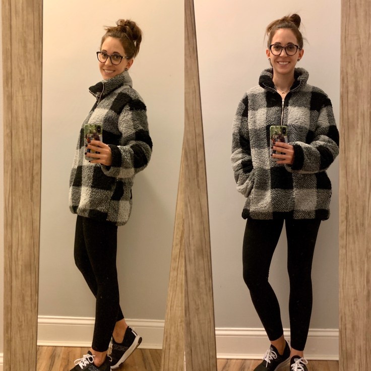 Good Morning! This plaid sherpa fleece became available as a lightening deal early this morning. This thing is so warm. I wore it two weeks ago when I took my daughter ice skating for the first time ever. This was my only coat that day on the ice and it did not disappoint! I am wearing the grey colored plaid, in my normal size, and I am happy with how loose and long it is. If you want a more fitted look then I suggest sizing down.