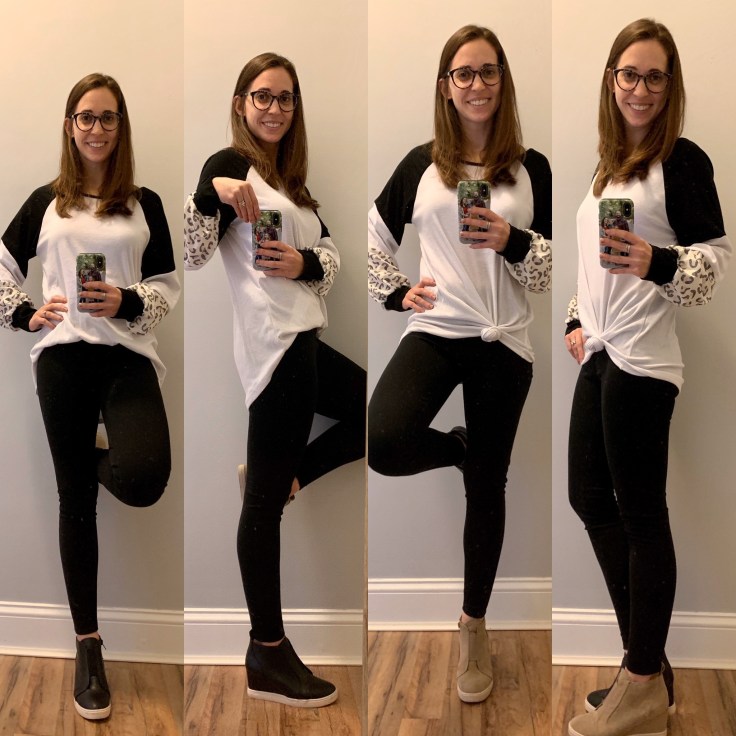 I am preparing to return to work tomorrow. Does this outfit say, “first day of second semester” to you? 🤣 I just haven’t decided which way to wear it or which wedge sneaker looks better. Anyone else put on two different shoes and do the flamingo pose to figure out which shoes to wear!? 🦩
