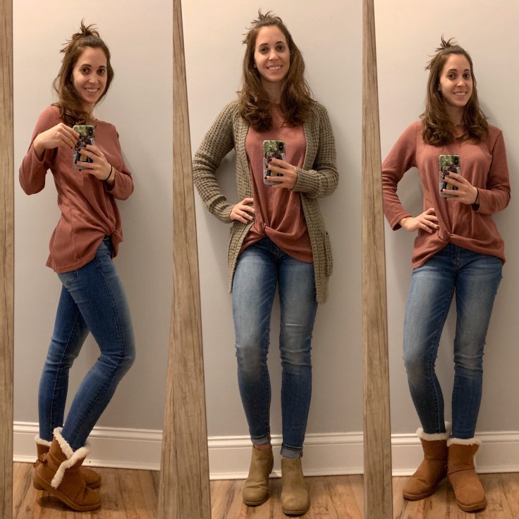 This Time and Tru duster cardigan has dropped in price online (limited sizes) and it is on clearance in stores too. The sleeves are a bit wider so you can comfortably wear a long sleeve shirt under it. I like to wear mine with leopard wedge sneakers.