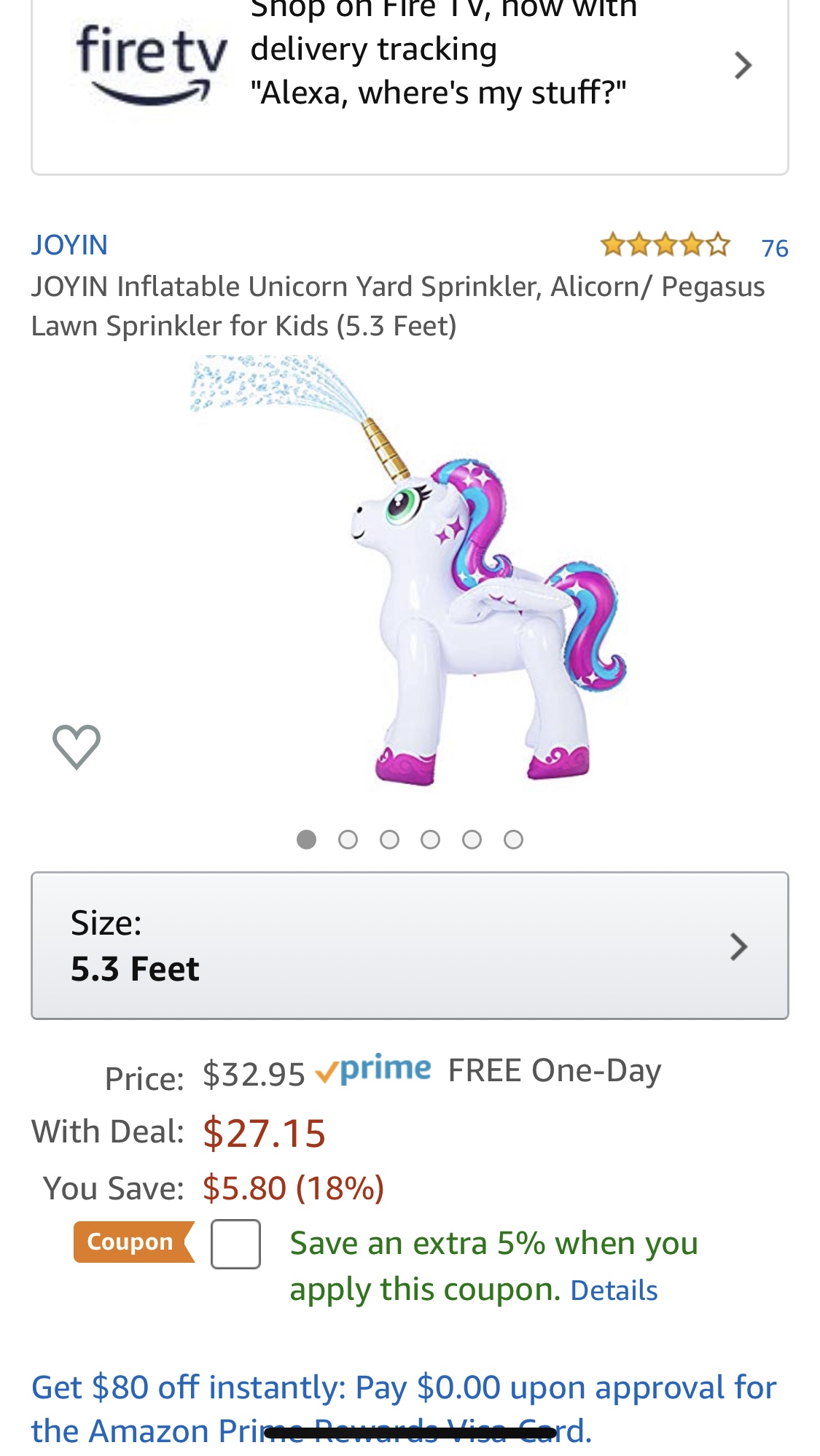 I bought this $23 unicorn sprinkler last week as a gift for my daughter’s 6th birthday- shhhh don’t tell her! Today, the larger one is a prime lightening deal for $4 more! Some of you may even see an additional coupon for 5% off under the price for both sizes.